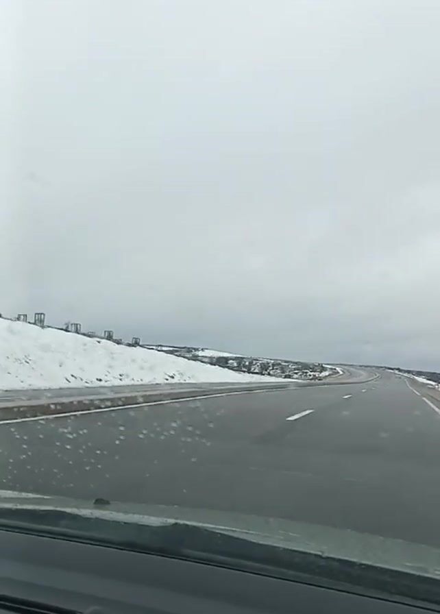 car driving on a highway on a cloudy day. There is snow along the sides of the road, and a town can be seen in the distance. Raindrops are visible on the windshield. Music is playing.