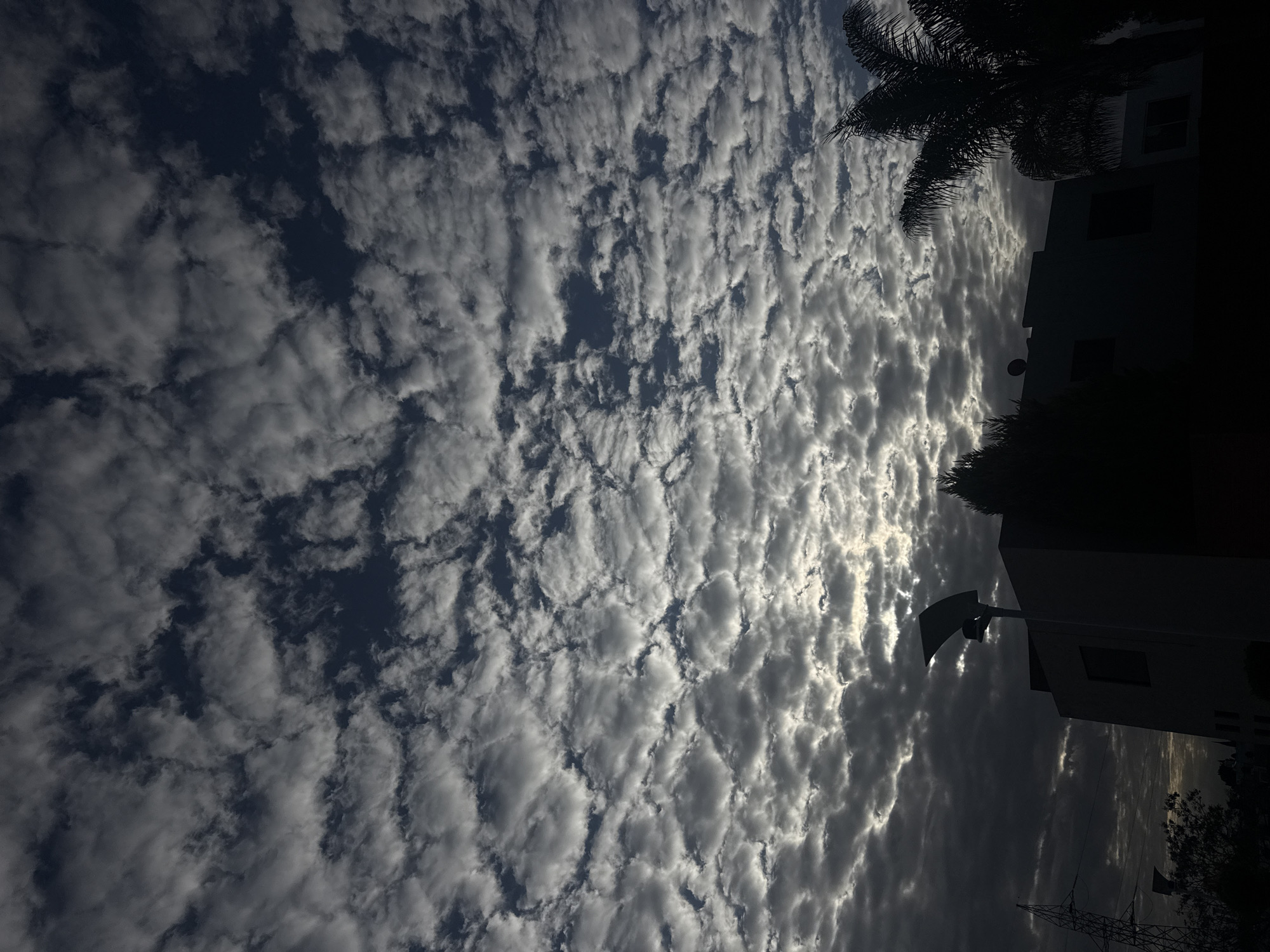 sky filled with altocumulus clouds. In the upper right corner are silhouetted buildings and a palm tree. At the bottom right are some trees and utility poles. It is daytime. The location is Heroica Puebla de Zaragoza, Mexico. There are no people visible.