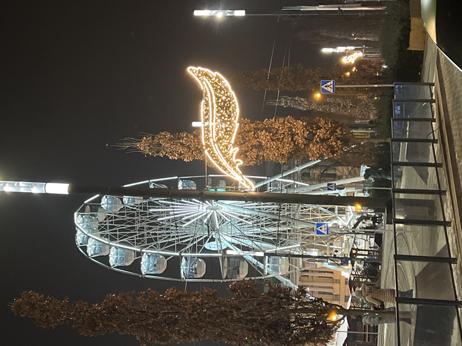 A nighttime scene reveals a Ferris wheel illuminated by white lights, with closed gondolas. Above the wheel, a large, decorative light in the shape of a leaf or crescent hangs in the air. Bare trees are scattered throughout the frame. Streetlights are visible in the background along with a road sign. A barrier lines the foreground, suggesting a walkway or viewing area. The image has a slightly rotated orientation.