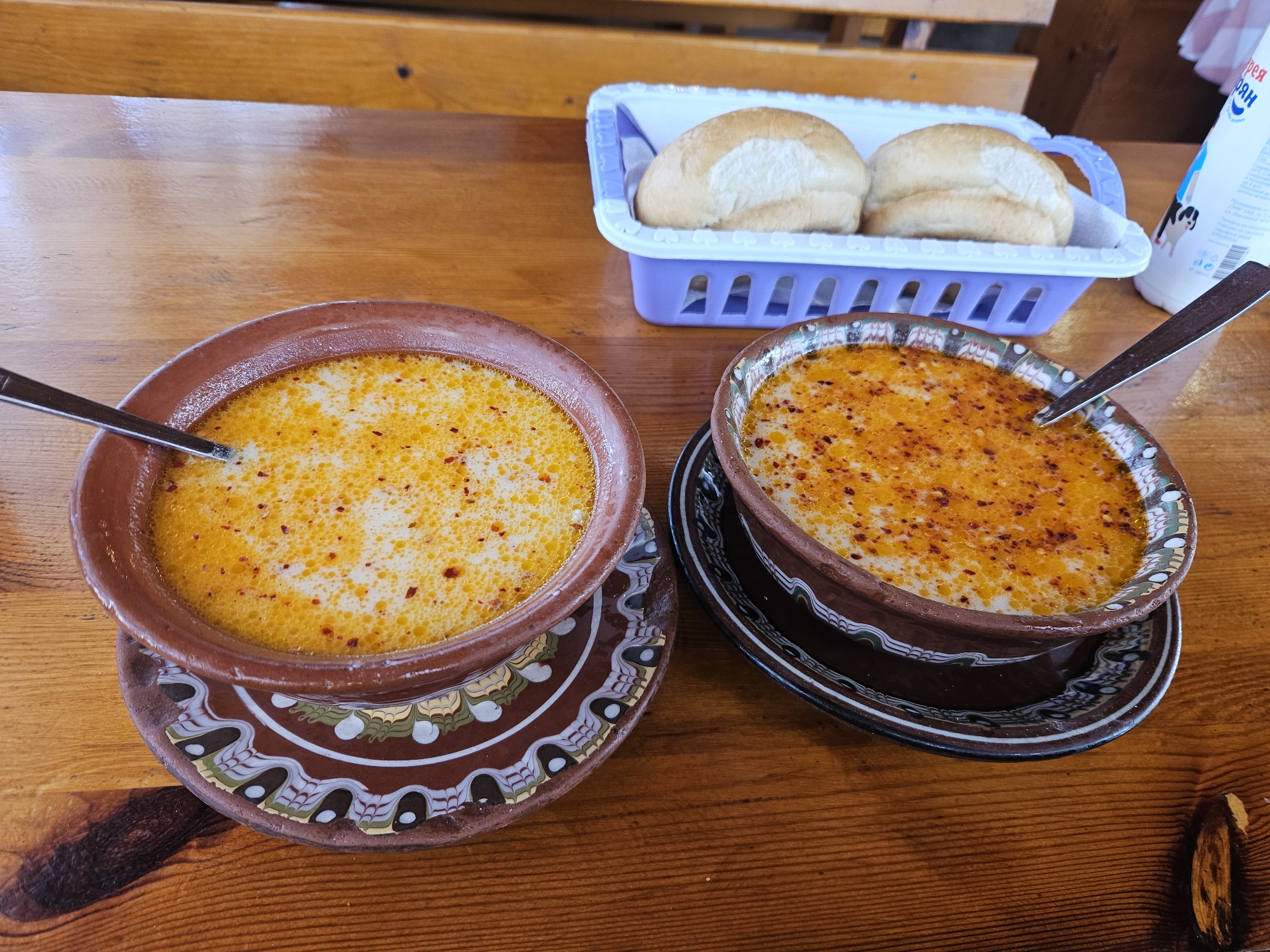 wooden table setting with two bowls of soup in earthenware dishes, a basket of rolls, and a carton of what appears to be yogurt. Each soup bowl sits on a decorative saucer with folk-art patterns. Both soups are creamy and yellow with a sprinkling of red spices. Spoons are in the soup bowls. The rolls are in a light purple plastic basket lined with a white cloth. A carton of yogurt is visible in the background. The location is likely in Krushevets, Bulgaria, inferred from the visual context of the food and decorative elements.
