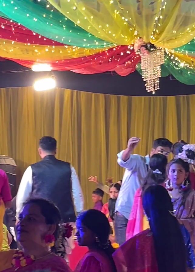 large group of people gathered at what appears to be a wedding reception. Many of the people are dressed in colorful traditional clothing. There are chairs, tables, and decorations all around. The ceiling is adorned with colorful fabric and lights, creating a festive atmosphere. Some people are taking photos and videos. There are a few young children in the group. Blue stage lights are also visible.