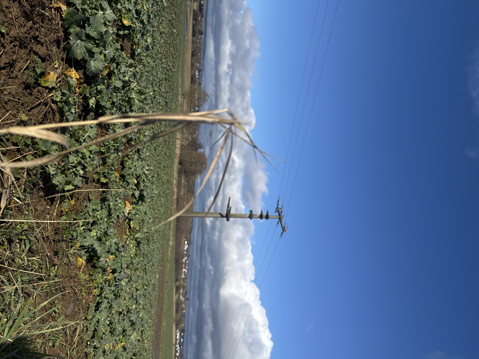 The scene depicts a rural landscape located outside Echzell, Germany. In the immediate foreground, a blurred, dry, light brown plant stalk rises vertically from dark brown soil and sparse green ground cover. The midground is occupied by an extensive agricultural field cultivated with numerous low-lying green plants, likely a Brassica crop, exhibiting some yellowed leaves. Towards the right side of the mid-to-background, a dark wooden utility pole equipped with multiple horizontal cross arms and insulators supports overhead power lines that traverse the frame. In the distant background, a treeline is visible on the left, partially obscuring a body of water. A residential settlement, identified by white structures with red roofs, stretches across the horizon, consistent with the town of Echzell. The sky is largely clear blue on the upper left, transitioning to an accumulation of white and dark grey cumulus clouds towards the right and horizon. No individuals, animals, or active interactions are observed within the frame.
