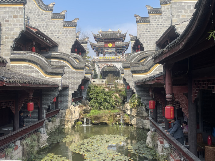A serene scene features a canal filled with lily pads, bordered by traditional Chinese buildings. Grey brick structures with curved, tiled roofs stand on either side, adorned with red lanterns. A more ornate pavilion is visible in the distance, framed by the architecture. Lush greenery and a small waterfall add to the tranquil atmosphere. People can be seen on the right, enjoying the view from a balcony.