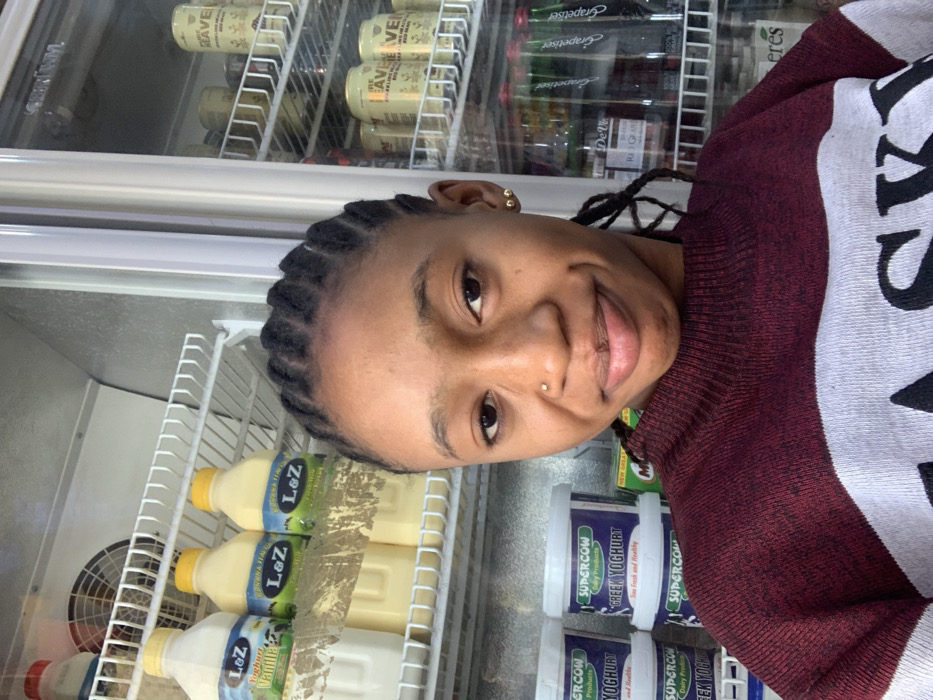 The image depicts a young person situated indoors in Aviation Quarters, Nigeria. The individual, with braided hair, a small stud piercing on their left nostril, and a small gold stud earring in their right ear, faces the camera directly with a subtle smile. They are wearing a long-sleeved sweater with a maroon upper section and a white lower section. Behind the person, two commercial-style refrigerated display units are visible. The unit to the viewer's left contains multiple bottles of L&Z Yoghurt Vanilla and L&Z Suya Milk on its upper shelf, and stacked tubs of SUPERCOW Greek Yoghurt on its lower shelf. A cooling fan unit is partially visible behind the upper shelf. The unit to the viewer's right displays rows of THE HEAVE SPARKLING MALT DRINK cans on its upper shelf, and bottles of Grapetiser and De Vira Red Grape juice on its lower shelf. The overall environment suggests a retail or convenience store setting for chilled products.