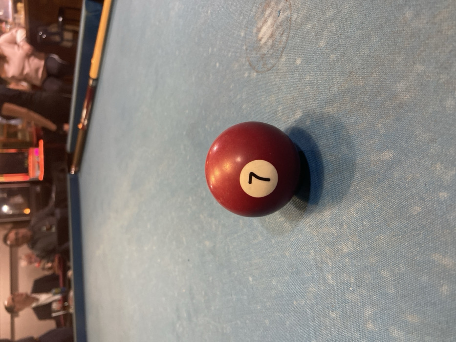 A red pool ball with a white circle displaying the number seven rests on a light blue pool table surface. A pool cue leans against the edge of the table to the left. The background shows people sitting at a bar with dark tones. A lighter circular marking is on the pool table surface in the upper center. The image has been rotated slightly.