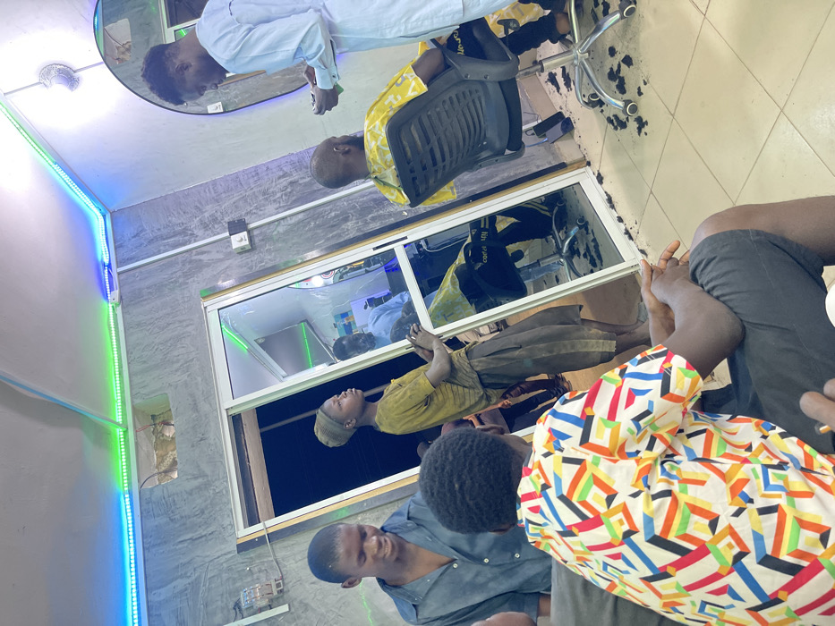 The image depicts an interior scene within a barbershop located in Unguwar Gabas, Nigeria