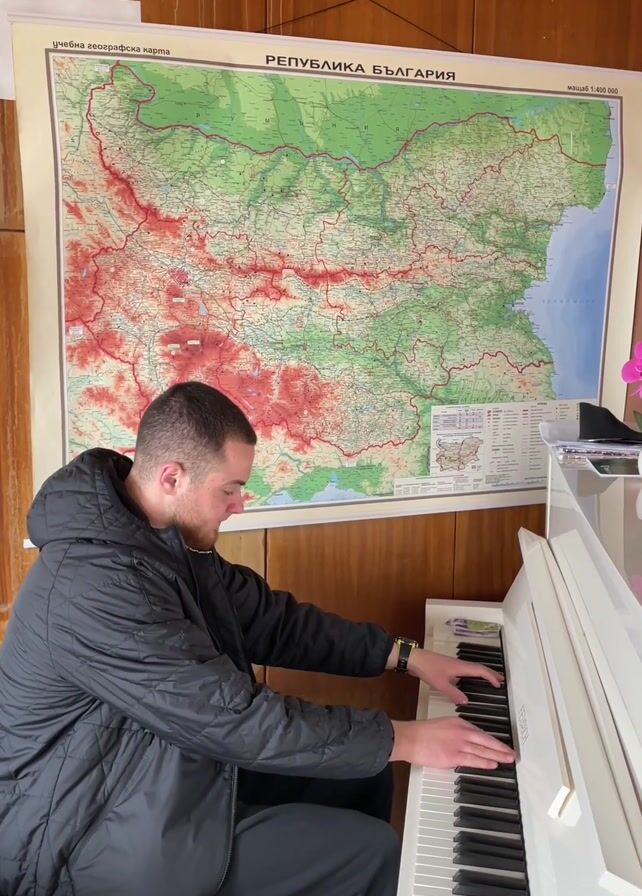 A man is playing a white electric piano. He is sitting in front of it, wearing a black jacket and pants. Behind him is a large map of Bulgaria hanging on a wooden wall. To the right of the piano is a clear container, and a pink flower is slightly visible. The man is focused on playing the piano, and his hands are moving across the keys. The lighting is even, and the scene is indoors.
