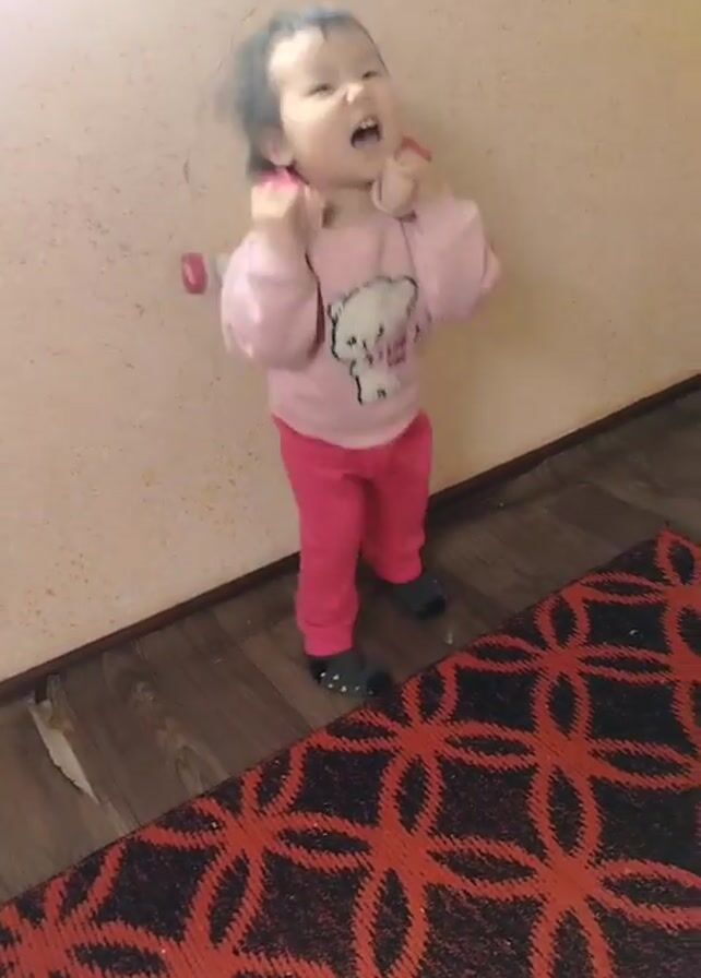A young child with dark hair stands in a corner between a light-colored wall and a dark wooden floor
