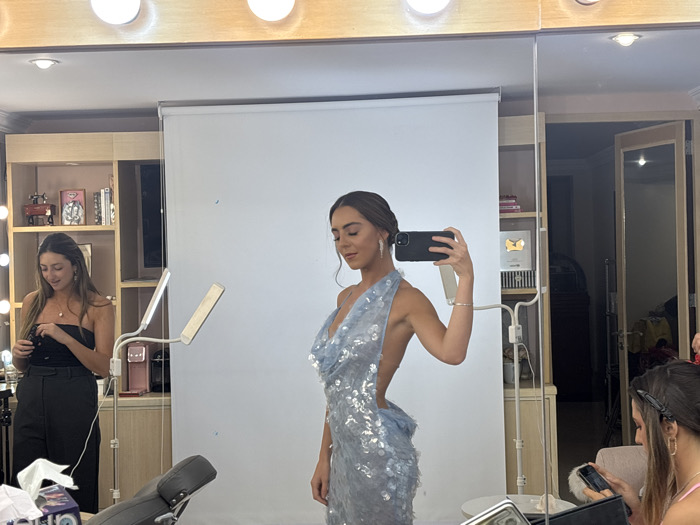 The image depicts an interior scene, likely a dressing room or studio, located in the city of Unknown, Unknown. A young adult female with dark hair, wearing a light blue sequined, open-back, halter-neck dress, stands centered, holding a black smartphone to photograph her reflection in a large vanity mirror. She is observing the phone screen. To her left, a second young adult female with long dark hair, dressed in a black strapless top and black pants, stands observing an item in her hands. Behind her, a wooden shelving unit holds decorative objects, books, and a visible YouTube Silver Play Button award. A white roller blind or backdrop is positioned behind the central figure. To the right, partially visible in a mirror reflection, a third young adult female with dark hair secured by clips, wearing a pink top, is seated and engaged with a smartphone. The foreground features a dark, adjustable salon chair and LED panel lighting on a stand. The room is brightly lit, with additional reflections of a door and other objects in the mirrors.