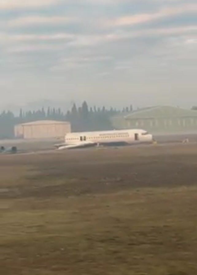 fuselage of an airplane sitting on a grassy field next to a runway. The airplane is white with what appears to be black lettering. It is missing its wings and tail. Two buildings and some trees are visible in the background. The sky is overcast. The camera appears to be moving in the foreground, perhaps on a car or truck. The scene seems to be at a small airport.