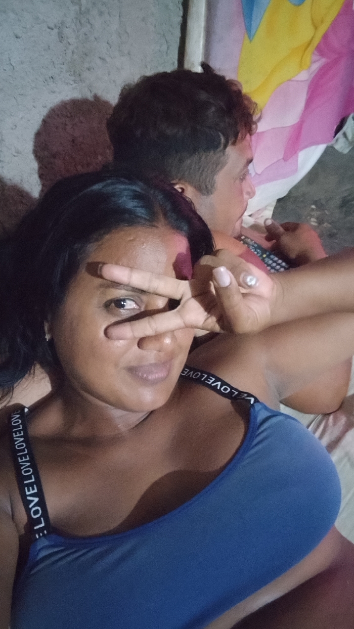 A woman wearing a blue tank top with "LOVE" printed on the straps holds up a peace sign, obscuring her eye. Behind her, a man with short dark hair is lying down holding a TV remote. The background consists of a textured wall on the left, colorful fabric or clothing on the right, and a hint of bedding underneath them. The lighting appears to be somewhat dim.