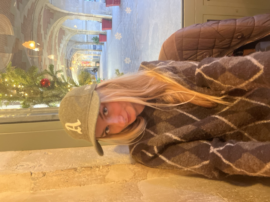 A woman in a grey baseball cap and patterned sweater leans against a light-colored wall, gazing at the camera. Behind her, an arched corridor decorated for winter is visible through a window. A Christmas tree with ornaments stands to the left of the frame, further emphasizing the seasonal setting. A brown quilted jacket is partially visible on the right. The image is taken indoors.