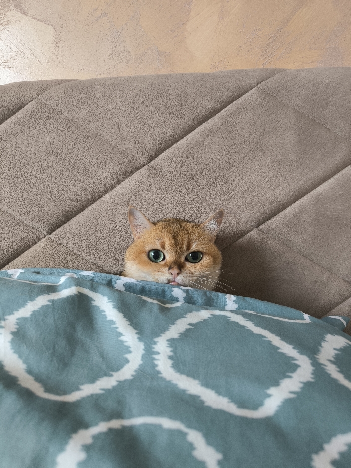 - "A ginger cat with piercing green eyes peeks over the edge of a blue and white patterned duvet" by FM-ySTmw1, licensed under CC BY 4.0
