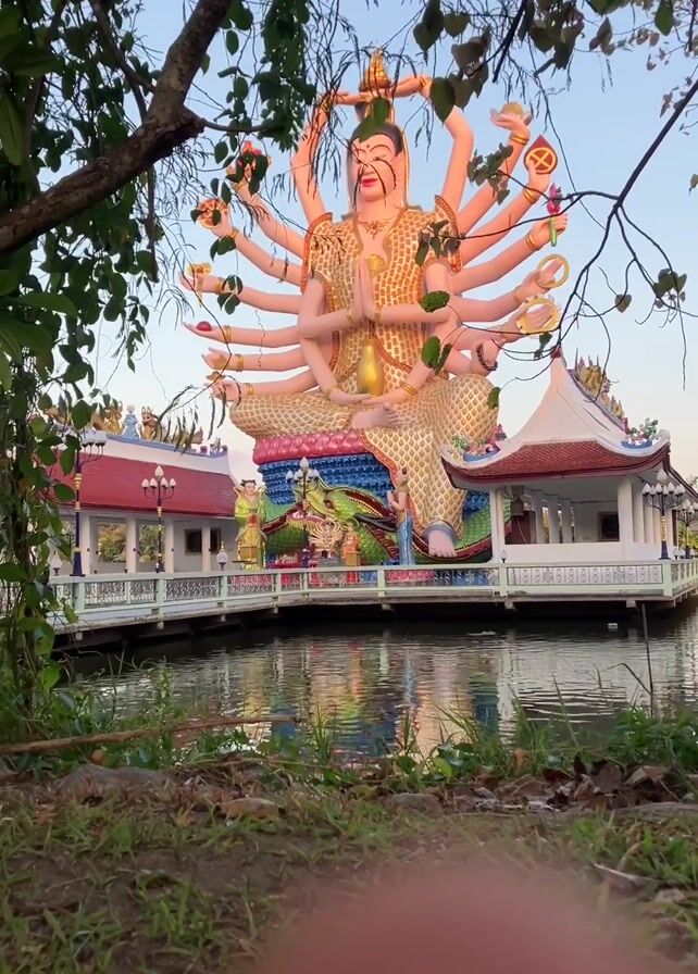 The video displays a statue with multiple arms situated in a pond. The statue, the main subject, is gold and seated in a lotus position, holding various objects in its numerous hands. The statue rests on a platform decorated with colorful figures, possibly depicting deities or mythical creatures. The platform is connected to the mainland by a white bridge. Behind the statue are buildings with traditional Thai-style architecture, featuring red roofs and white walls. The pond reflects the statue and the surrounding buildings, creating a mirror-like effect. The camera is positioned low to the ground, with green grass and some vegetation in the foreground. A tree with green leaves partially frames the view, adding depth to the scene. The sky above is light blue, suggesting it may be early morning or late afternoon.