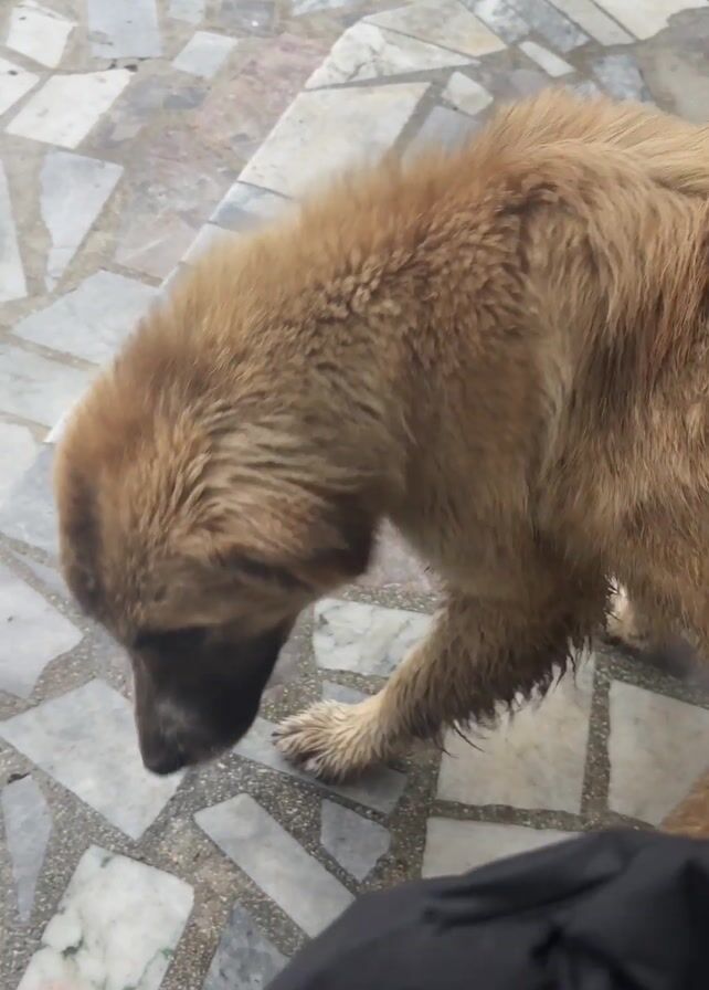 A close-up shot shows a person petting a brown and tan dog on a patterned tile surface. The dog, which is standing, has a dark muzzle and wet fur. The person's hand, clad in a black sweater sleeve, gently strokes the dog's face and head. The focus is on the interaction between the person and the dog.