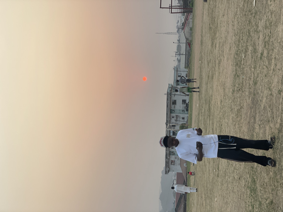 The scene depicts an open, dry, and sparsely vegetated field in Lokoja, Nigeria, under a hazy, dust-laden sky with a prominent, intensely orange-red sun low on the horizon, indicative of either sunrise or sunset
