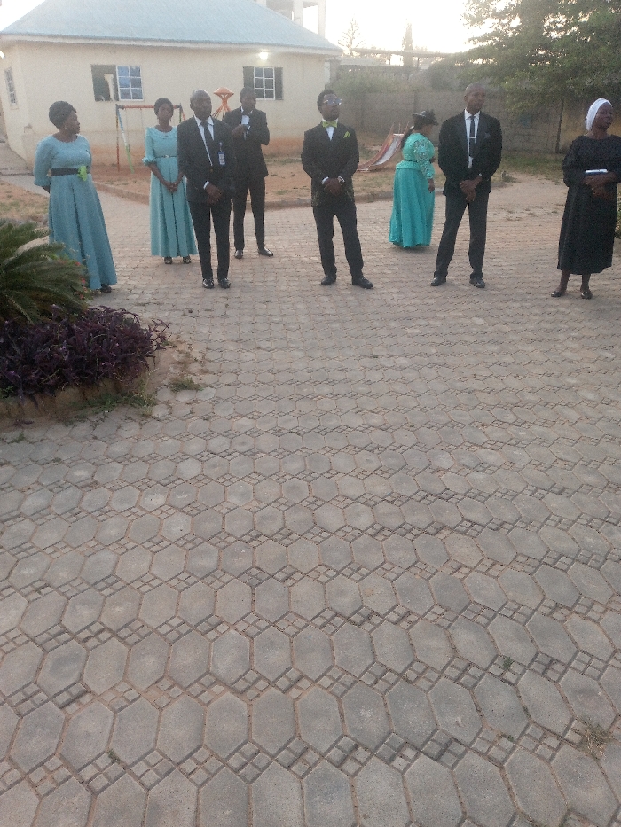 A gathering of people, mostly wearing formal attire. Three women wear long blue dresses, one with a green sash. Another woman is dressed in black with a white head covering. Four men don suits and ties, and one man wears a bow tie and suspenders. They stand on a paved area of interlocking geometric shapes in front of a building with a swing set in the background. A garden bed is to the left.