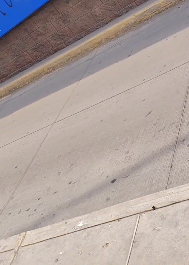 A person on a skateboard attempts an ollie on a concrete street in an urban environment. The individual, wearing a dark jacket, shorts, a light-colored cap, and tan sneakers, is seen moving towards the right side of the frame and jumps, with the board not clearing the ground. A concrete pole with peeling paint stands prominently on the right side of the video. In the background, there's a blue wall with graffiti. The concrete street has visible grid patterns. The video is shot from a high angle and the camera slightly pans downward.