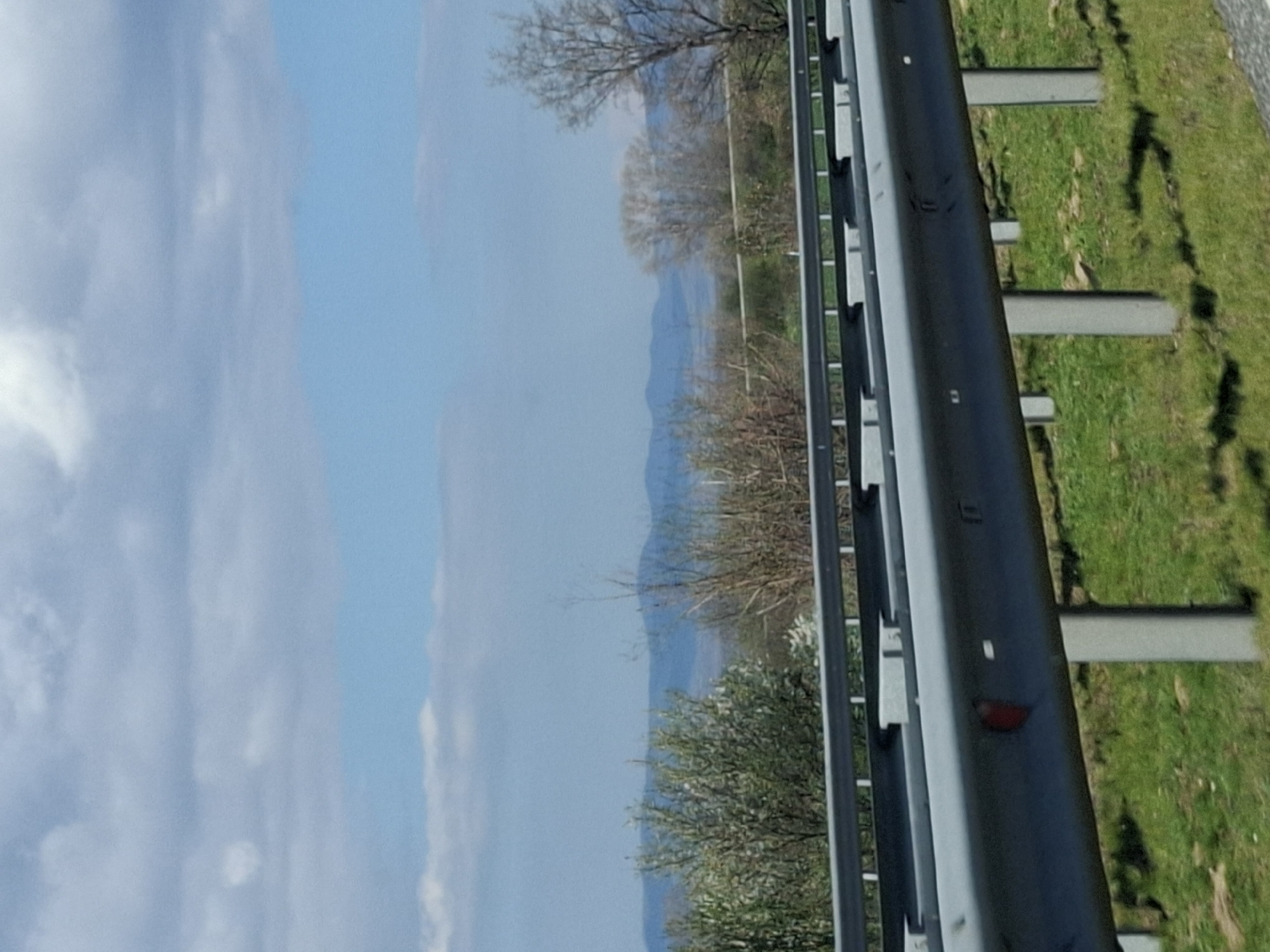 landscape view from a vehicle traveling along a road in Shtarkovo, Bulgaria. A metal guardrail runs along the right side of the frame. Beyond the guardrail, there is green grass. Further in the distance are trees and hills under a blue sky with clouds.