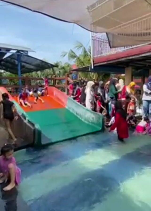 The scene shows a group of people, mostly children, enjoying themselves at a water park. Several children are sliding down a short, red, green, and brown slide into a shallow pool. The pool is patterned with a blue and grey design. On the side of the slide, a crowd of people, mostly women and children, are gathered, some taking pictures or videos of the sliders. Many of the women are wearing headscarves, indicating they may be Muslim. In the foreground, a young girl is seen near the edge of the pool. The area is partially covered by a white awning, with tropical trees visible in the background.