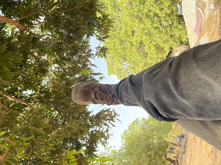 The image depicts a first-person perspective from a seated or reclining individual in what appears to be a semi-rural outdoor setting in Osara, Nigeria. The lower leg and foot of the person are prominent in the foreground, angled upwards. The foot wears a brown, sturdy, lace-up boot, and the leg is clad in dark-colored (possibly charcoal grey or dark green) trousers. Above the leg and boot, a dense canopy of lush green leaves from an overhead tree dominates the upper portion of the frame, interspersed with patches of bright blue sky. The background, visible to the sides and beneath the leg, shows a dirt ground area. To the left, several indistinct figures, including adults and children, are visible in the distance. They appear to be casually gathered or moving within an open, treed area. A small, low structure or collection of items is present on the ground. To the right, another large green tree is visible, along with a small, rudimentary structure with a light-colored roof. Adjacent to this structure is a substantial pile of light-colored, granular material (resembling sand or gravel), partially covered by a multi-colored tarp or mat. The overall impression is one of a bright, sunlit day in an outdoor communal space.