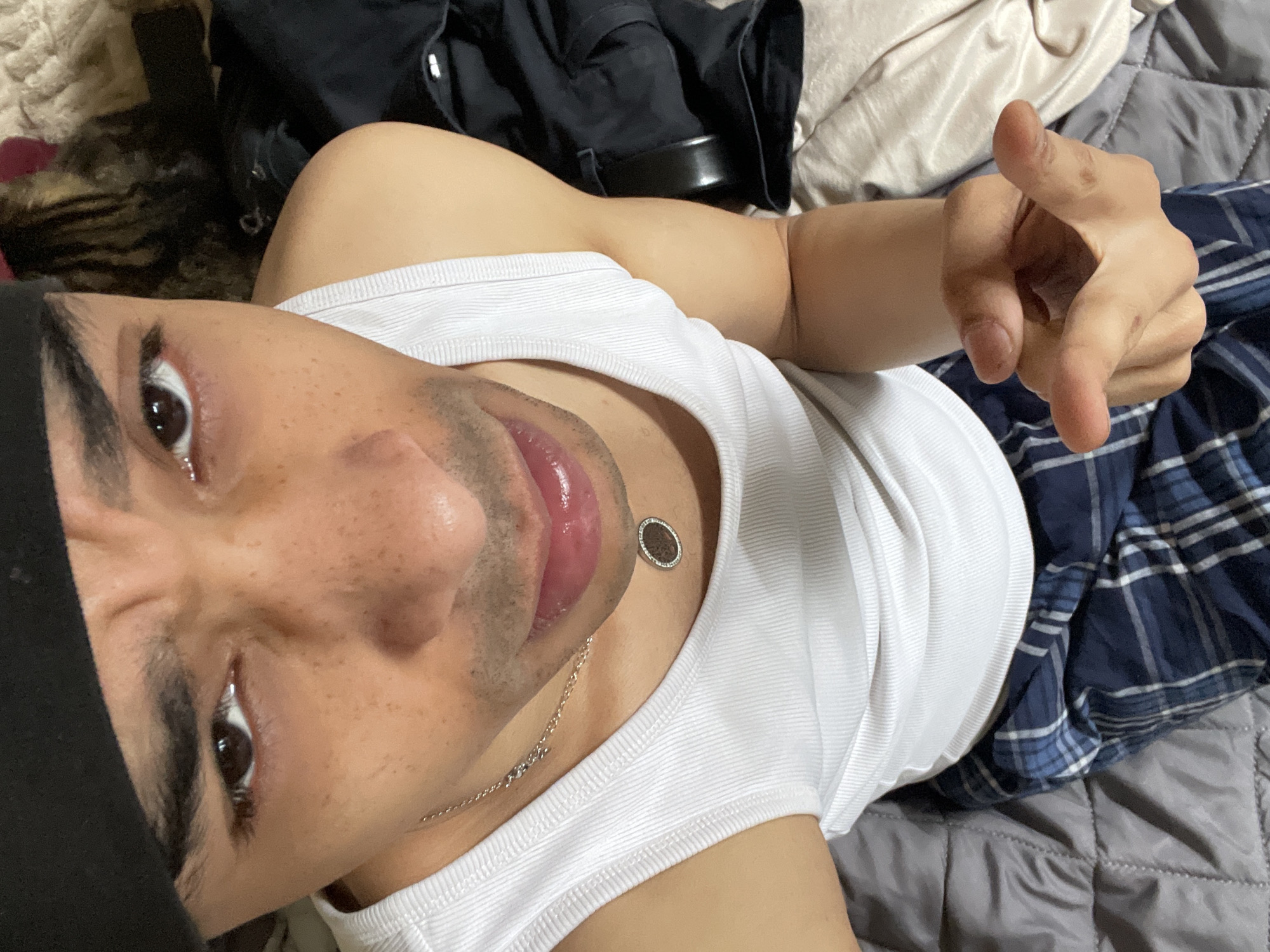 A male subject is depicted in a high-angle, close-up indoor shot. The specific location within the city of Plaisir, France, cannot be determined from the visual information provided in the image. The subject has a medium complexion, dark eyes, and visible short facial hair. He wears a black head covering that partially obscures his forehead, and a white ribbed tank top. Around his neck, a thin silver chain with a circular, dark-centered pendant is present. The lower half of his body is clothed in blue and white plaid pajama pants. His facial expression shows furrowed brows, a direct gaze towards the camera, and a slightly open mouth with full, pink lips. His right hand is extended towards the camera, fingers loosely curled inwards, with the palm facing upwards. The subject appears to be seated or reclining on a surface covered by a gray quilted blanket or duvet. To the right of the subject, beige and dark-colored fabrics are visible, suggesting an unmade bed or a casual domestic setting.