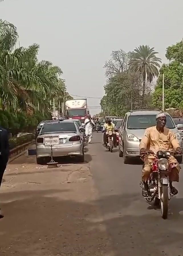 street with heavy traffic, including cars, motorcycles, and a large truck. Several pedestrians are visible on the side of the road, while others walk in the middle of the road. The environment includes trees and a parking sign. The sky is overcast.