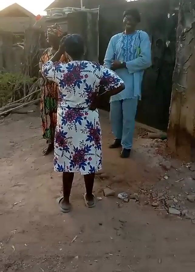 Three people stand in a dirt yard outside a building in the daytime. Two women are to the left of the video, and a man stands to the right. The woman closest to the camera wears a short dress with white fabric and a repeating pattern of blue and red flowers. Her hair is covered with a dark headscarf. She has her hands on her hips and looks at the man. Behind her to the left is another woman wearing a patterned dress in greens, oranges, and reds. She also has a headscarf and holds something in her hands. To the right, the man wears a long-sleeved light blue shirt with embroidered detailing. He wears light blue pants and black shoes. He holds a green reusable bag. The area is a dirt lot with some debris, and behind the people is a building with a fence-like gate. The sky is lightly colored and sunny.