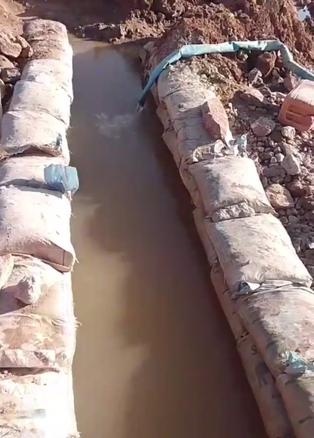 The camera looks down into a trench filled with murky brown water. The trench is bordered on either side by stacks of large, heavily soiled sandbags. The ground surrounding the trench is mostly red dirt and scattered rocks, with some patches of vegetation and a few construction-related objects. In the background, a white car is visible. A person wearing beige pants and a light-colored shirt leans into the frame, partially obscuring the view.