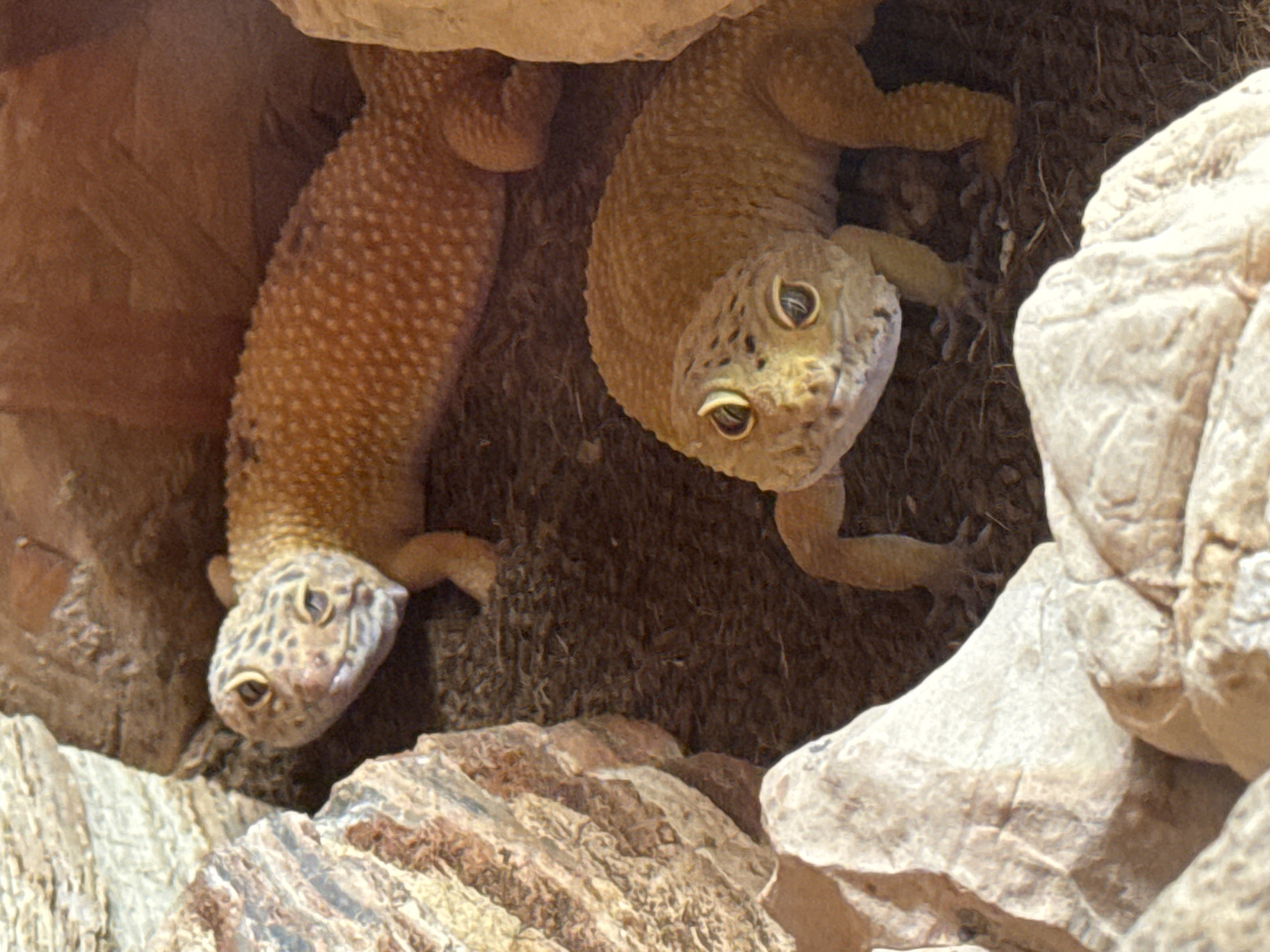 The image displays two leopard geckos (Eublepharis macularius) within an artificial, rocky enclosure. The substrate is a dark brown, loose material, possibly peat or similar bedding. Several light-colored, irregularly shaped rocks are present, forming crevices and uneven terrain. One gecko is positioned in the upper half of the frame, oriented diagonally with its head facing left and body extending to the right. It exhibits a yellowish-orange dorsal coloration with scattered darker spots and a distinct bumpy skin texture. Its head is partially obscured by a rock on the left. The second gecko occupies the lower-central portion of the frame, positioned facing directly towards the viewer. Its head is prominent, displaying large, light-colored eyes with dark, vertical pupils. Its body matches the coloration and texture of the first gecko. Both geckos appear stationary, with no discernible active movement or direct interaction between them. The surrounding environment consists of textured rocks, predominantly tan or off-white, forming a simulated arid habitat. A large, multi-faceted rock mass is visible on the left side of the frame, extending into the foreground. The lighting suggests an internal light source illuminating the enclosure. No visual cues within the image allow for the determination of a specific geographical location such as Orsay, France; the scene depicts an indoor, contained animal habitat.