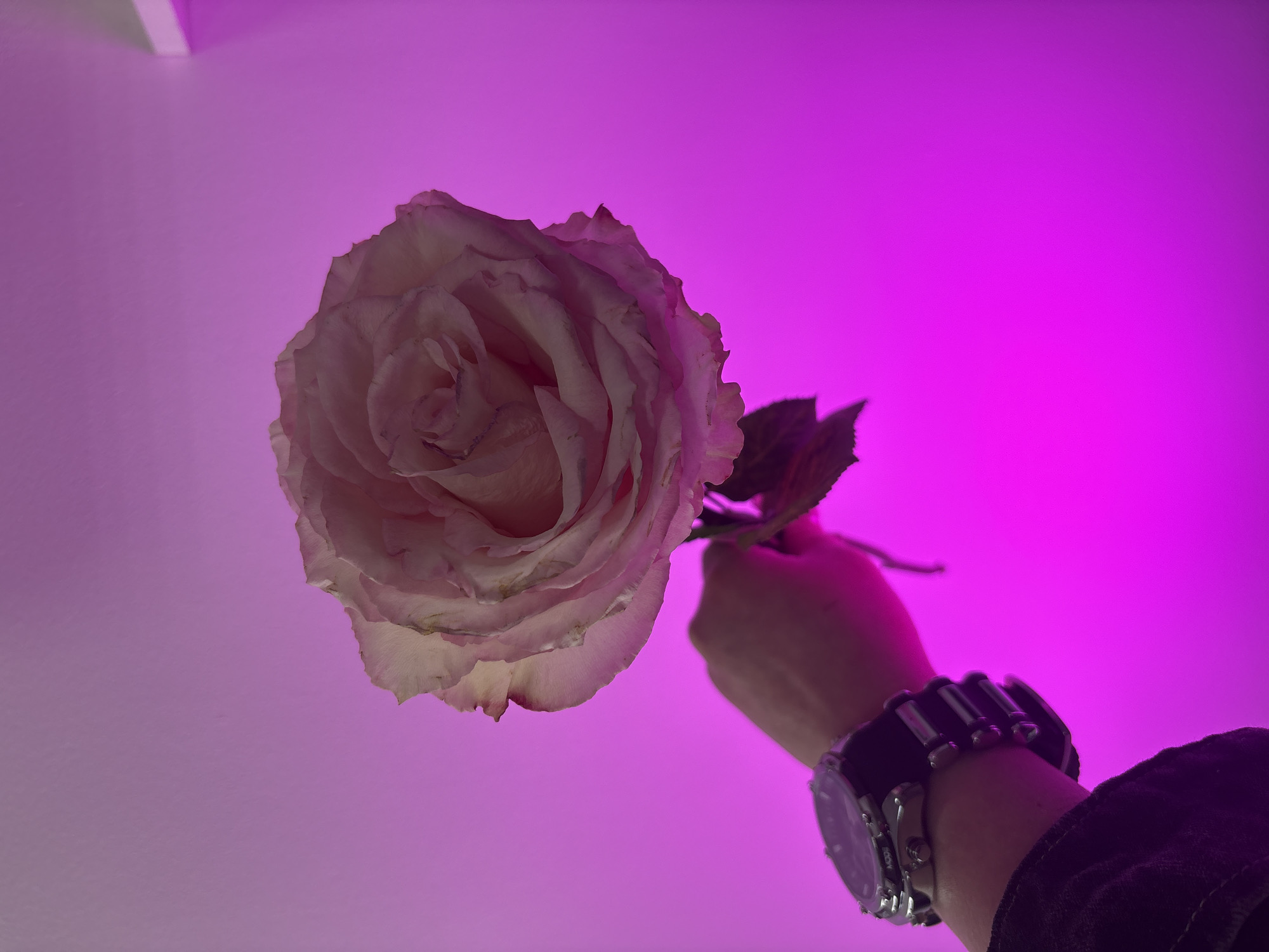 - "A low-angle shot depicts a person holding a large, light pink rose against a gradient background of light to dark magenta" by FM-bUuVG2, licensed under CC BY 4.0