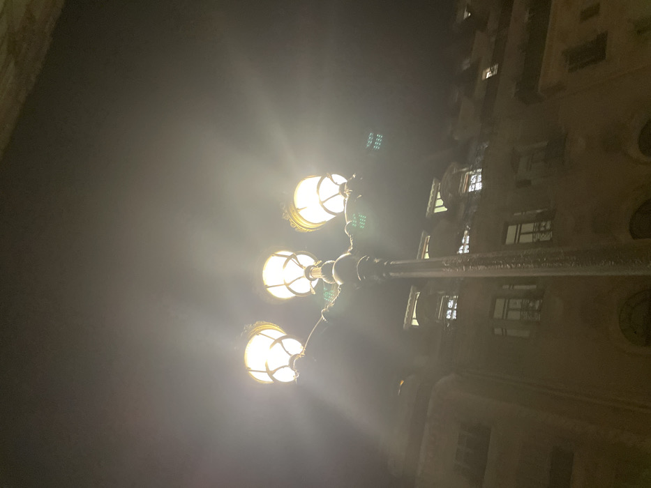 - "A low-angle, nighttime photograph captures an ornate, dark-colored streetlamp featuring three active, brightly illuminated lanterns" by FM-K3kM02, licensed under CC BY 4.0