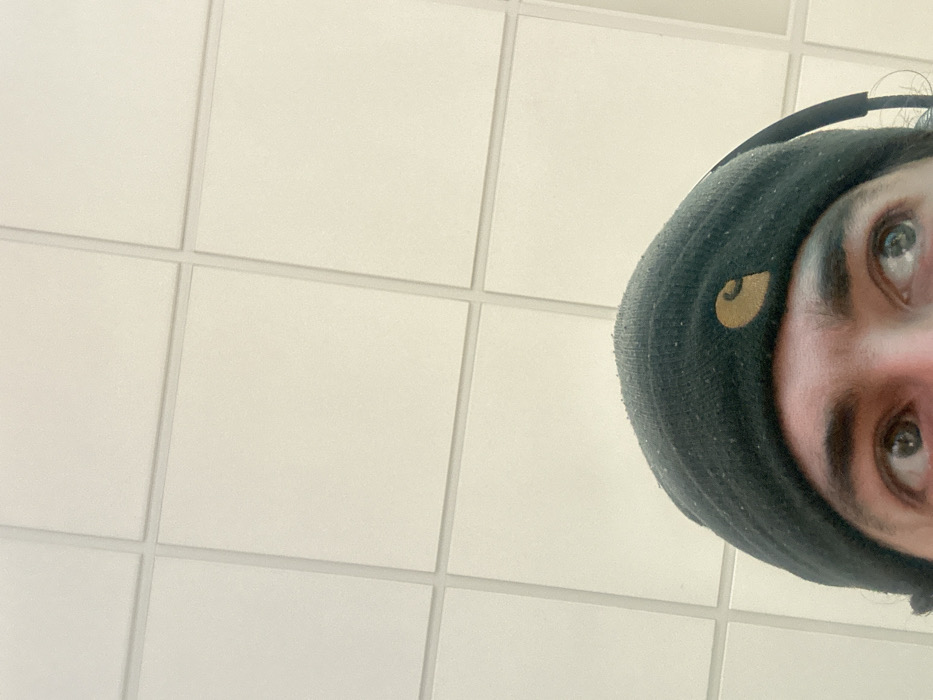 The image presents an upward-angled, close-up view of an individual from the nose bridge to the top of the head. The subject wears a dark grey knit beanie, adorned with a gold "Carhartt" logo (a stylized 'C') on its left side. The beanie's surface shows minor lint or fibers. Below the beanie, the individual's eyes, exhibiting light-colored irises, are directed upwards and slightly to their right. Portions of dark eyebrows are visible above the eyes. A black strap, consistent with an earphone or headphone cable, is partially visible on the right side of the head, emerging from beneath the beanie. The background is a light-colored, paneled ceiling composed of square acoustic tiles arranged in a grid pattern with visible seams. The lighting is even and diffuse. The image itself contains no visual information to confirm the specified location of Carvin, France.