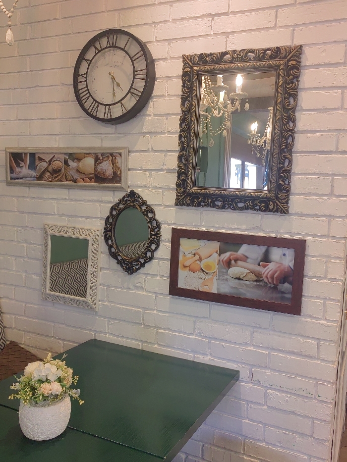 This image displays an interior wall scene within an establishment located in Nesebar, Bulgaria. The wall is constructed of white-painted bricks. Arranged on the wall are several decorative objects: * In the upper left, a large, circular wall clock with a dark frame and Roman numerals is mounted. * Below the clock, a horizontal rectangular framed picture depicts a composite image illustrating baking ingredients and processes, including flour, grains, eggs, and dough. * To the right of the clock, a large rectangular mirror with an ornate, dark gold-toned frame reflects a multi-branched chandelier and an ambiguous bright light source, possibly an entrance or window. * Below the framed baking sequence, a smaller rectangular mirror with a white, ornate frame is present. * Adjacent to the white-framed mirror, a smaller oval mirror with a dark, ornate frame is mounted. * Below the large rectangular mirror, a horizontal rectangular framed picture shows a pair of hands using a wooden rolling pin to knead dough, with additional baking ingredients like eggs and flour visible on a surface. In the lower-left foreground, a dark green rectangular table is partially visible. On this table, a white, textured spherical vase contains a small floral arrangement composed of light-colored flowers, predominantly white and soft pink. A section of a patterned cushion or seating is visible at the far left edge of the frame. No individuals are present in the scene, and no active interactions are depicted beyond the static arrangement of objects.