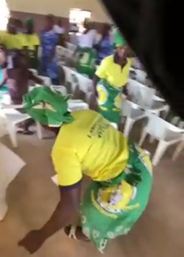 The video depicts a wedding celebration indoors. Guests, mostly women, are dressed in colorful attire. One woman, wearing a yellow shirt and green patterned skirt, dances energetically. A bride in a sparkling white gown, holding a bouquet, is escorted by a man in traditional West African attire. People are seated on white plastic chairs, and the room appears to be a simple hall with a corrugated iron roof. The atmosphere seems joyous and celebratory.