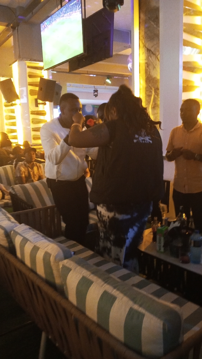 A group of people are gathered indoors, possibly at a bar. A man in a white jacket and black pants is facing the camera. A woman with long dark hair is standing next to him, with her back to the camera. To the right, a man in an orange shirt is observing. There's a television showing a soccer game in the background. The bar's atmosphere is bright, with striped couches and bottles on a table nearby. The setting appears relaxed and social.