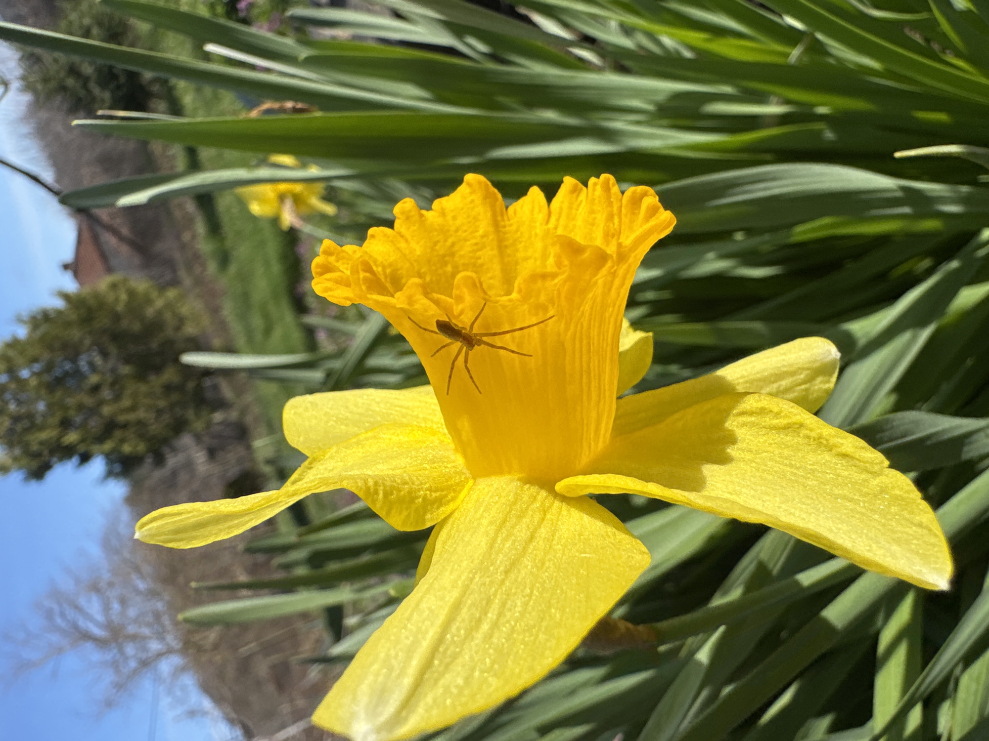 A close-up photograph captures a vibrant yellow daffodil flower in full bloom, centered in the frame. A small, slender, light brown spider rests on the inner, textured surface of the daffodil's trumpet-shaped corona, positioned towards the left side of the flower. The daffodil is surrounded by multiple upright, green, blade-like leaves, with additional blurred yellow daffodils visible in the midground to the right. The background is out of focus, revealing a clear blue sky above a distant hillside. This hillside contains sparse trees, green ground cover, and a portion of a building featuring a reddish-brown tiled roof. The scene is brightly illuminated by direct sunlight, casting shadows among the foliage. The location is Bardarevo, Bulgaria.