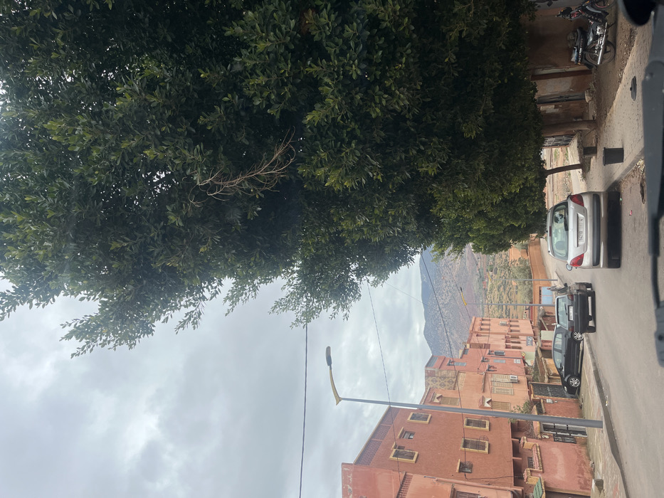 This image depicts a street scene in Ouaouizert, Morocco, under an overcast sky. The view is from inside a vehicle, with a portion of the dashboard visible in the lower foreground. The street, appearing to be paved, slopes slightly downwards into the distance. On the left side, a row of multi-story buildings, predominantly painted in a peach or salmon color, lines the road. These buildings feature multiple windows, some with bars or dark frames, and a few balconies. One building has an air conditioning unit mounted on its facade, and another displays a patterned tapestry or fabric hanging over a window opening. A modern-style street lamp with a yellow-gold fixture stands prominently on the left. Utility lines traverse the upper middle of the frame. On the right side of the street, a dense line of large, leafy trees with dark green foliage grows along a sidewalk. A noticeable dead, bare branch extends downwards from one of these trees. A black trash can is visible on the sidewalk near the base of the trees. Further along the sidewalk, two motorcycles or mopeds are parked near a building facade. Vehicular traffic includes a silver hatchback (possibly a Peugeot 207) with Moroccan license plate `14289 | 19`, parked facing away from the camera on the right side of the street. A dark grey or black hatchback is observed driving away from the camera in the left lane, and a black sedan is partially visible parked behind it on the left. In the background, distant mountains with arid, rocky slopes are visible under the cloudy sky, suggesting a semi-mountainous landscape surrounding the city. No individuals are discernible in the scene.