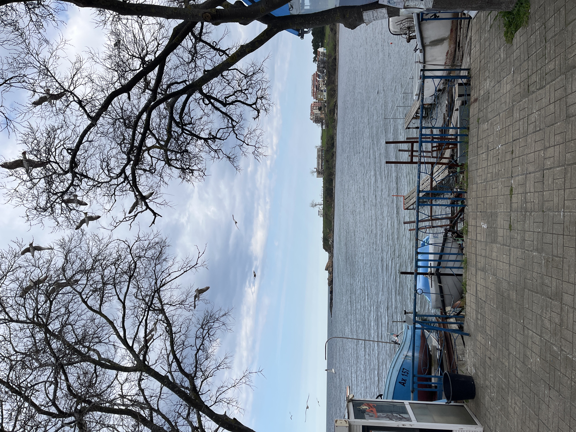 The image depicts a waterfront scene in Ahtopol, Bulgaria. In the foreground, bare tree branches frame the view, with several birds in flight among the branches. Adjacent to the water, a paved walkway runs along the shore. Several small boats are moored along the walkway, secured by blue metal railings. Across the water, a strip of land is visible, dotted with buildings and vegetation. The sky is partially cloudy with a mix of blue sky and white cloud cover. The overall color palette is dominated by blues, greys, and browns.
