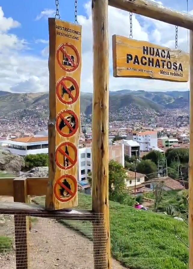sign for "Huaca Pachatosa," which indicates an altitude of 3450 meters above sea level, and a wooden sign with a list of restrictions, including no horses, dogs, fire, or smoking
