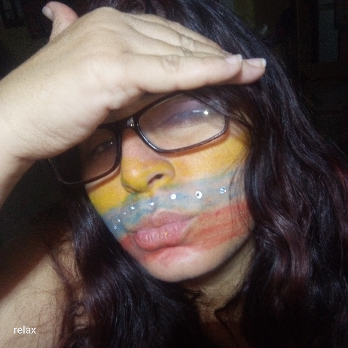 A woman with shoulder-length dark, wavy hair looks at the camera, wearing glasses. Her hand covers the top of her forehead. Her face is painted with horizontal stripes of yellow, blue, and red, reminiscent of a flag, and adorned with small, shiny rhinestones just above her lips. The background is dark and indistinct, contributing to a close-up, personal feel. The word "relax" is faintly visible in the lower left corner of the image.