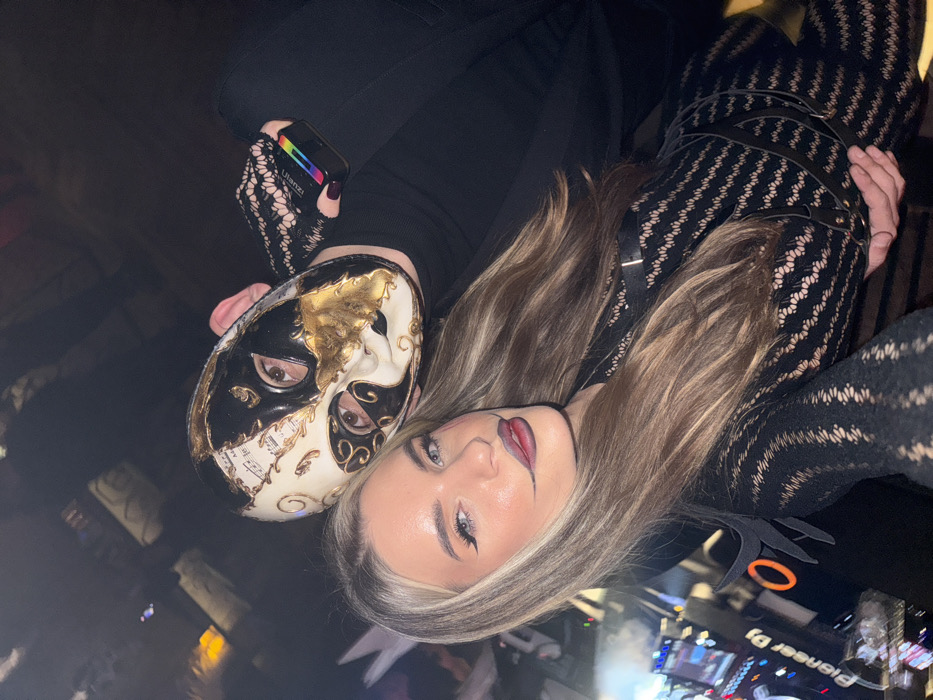 An indoor, dimly lit environment consistent with a nightclub or music venue in Berlin, Germany, is captured in a close-up, diagonally oriented photograph featuring two individuals. The foreground subject is a female with long, light brown hair featuring blonde highlights. Her face displays detailed makeup, including winged black eyeliner and dark red lipstick with black lines extending from the corners of her mouth. She wears a form-fitting, black, long-sleeved garment with a patterned, possibly crocheted or lace, texture. A black multi-strap harness is visible across her torso, and a black, wing-like decorative element is present on her left shoulder. She looks directly into the camera. The second individual, positioned behind and to the right of the first, wears an elaborate Venetian-style mask. The mask is sectioned, with one half off-white decorated with musical notation and gold accents, and the other half black with gold accents. Two brown eyes are visible through the mask's openings. This individual wears a black long-sleeved top. Their right hand, adorned with a black fingerless lace glove and dark red painted fingernails, holds a black electronic device branded "Ulanzi," which displays a vertical rainbow-colored light strip on its side. The background is dark and blurred. To the lower left, a professional DJ mixing console bearing the "Pioneer DJ" logo is visible, featuring illuminated buttons and screens displaying digital interfaces. Other ambient lights and indistinct forms of individuals are present in the distant background.
