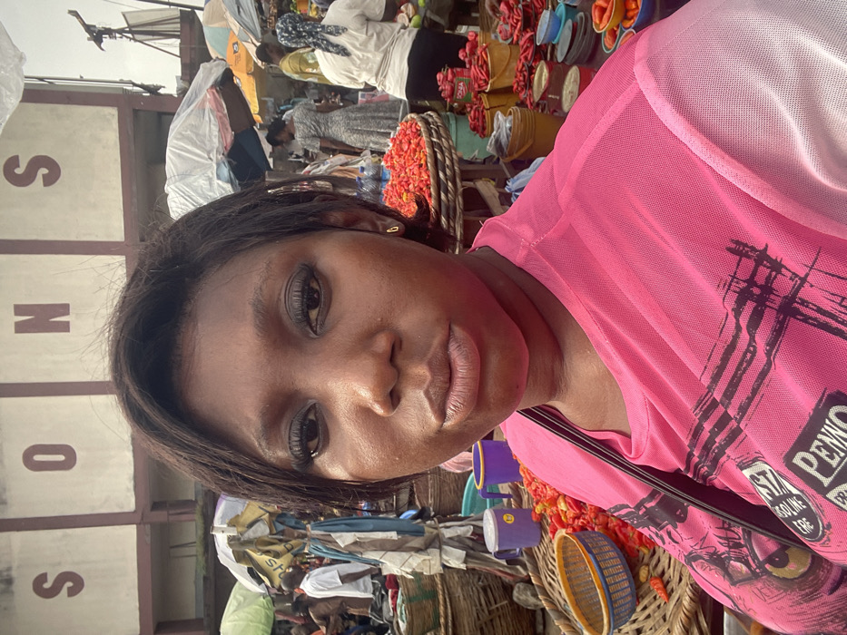 The image depicts a crowded outdoor market scene in Ebute-Metta, Nigeria, specifically identifiable as part of the Oyingbo Market complex due to the prominent "SONS" signage on a multi-story building in the background. The primary subject is a dark-skinned female, positioned in the foreground and center, facing the camera as if taking a selfie. She has dark hair styled in a bob, visible dark eyeliner, and slightly puckered lips. She wears a bright pink short-sleeved top featuring black graphics, and a small gold-colored hoop earring is visible in her right ear. A dark strap, possibly from a bag, crosses her left shoulder. The mid-ground and background reveal a bustling market environment. To the subject's left, large quantities of red peppers are displayed on woven mats or in large, round woven baskets. Smaller plastic mugs in purple and white are also present. To her right, more red peppers are arranged in various containers, including plastic buckets and smaller colorful bowls (light blue, orange). Several other individuals are visible throughout the market: a male in a white t-shirt to the left, a female in a patterned dress in the center-right, and another female in a white top and a blue-and-white headscarf to the far right, standing near additional produce. Market stalls are covered by white tarpaulins and colored umbrellas, indicating sun protection. A tall, dark, tripod-like structure is visible above the market on the far right. The most prominent background feature is a light-colored concrete building with the red-brown letters "SON S" (likely "SONS") clearly visible on its upper facade, consistent with the Oyingbo Market architecture. The sky is overcast.