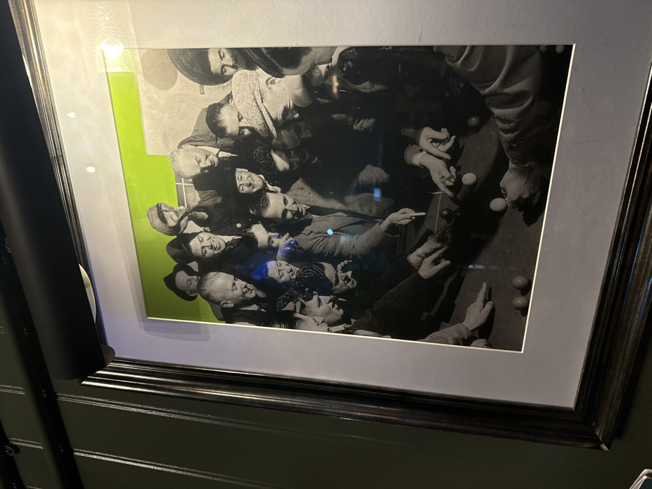 A framed black and white photograph, partially colorized, is displayed on a dark green paneled wall in an indoor establishment in London, United Kingdom. The photograph is contained within a silver-colored frame with a light gray mat. A dark overhead track is visible above the frame. The photograph depicts approximately fifteen to twenty individuals, predominantly adult males, gathered closely around a table, engaged in a game resembling billiards or pool. Most subjects are smiling or laughing, looking intently downwards. Their attire, including fedoras, flat caps, suits, and collared shirts, suggests an early to mid-20th-century setting. Multiple hands are visible reaching onto the table surface, with several individuals holding cue sticks. Several light-colored billiard balls are present on the dark table. A prominent section of the background within the photograph is highlighted in a vibrant lime green color, contrasting with the monochromatic figures. The scene captures a moment of social interaction and amusement around a recreational activity. The current location is an unspecified indoor establishment in London, United Kingdom.