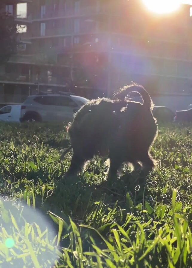 small, dark-colored dog wearing a neon green harness standing in a grassy area, sniffing the ground. The sun is low in the sky, creating a bright glare and backlighting the dog. Cars are parked in the background, with a building visible behind them. The grass is green and slightly overgrown.