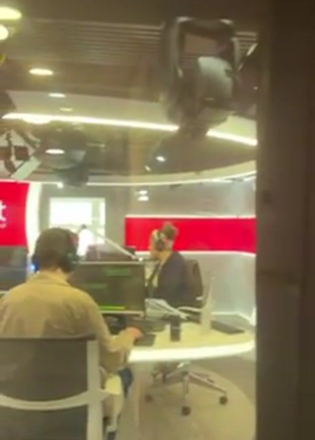 The video begins with a view through a glass pane into a radio studio. Two people are working at desks with computers and microphones. One person wears headphones and sits in front of a computer screen displaying waveforms. The other person is also wearing headphones and appears to be speaking into a microphone. Behind them is a large red sign that reads "Heart" and "Turn up the feel good". The camera then moves away from the studio and descends towards a woman with blonde hair who is wearing a brown patterned bag. The video abruptly ends.