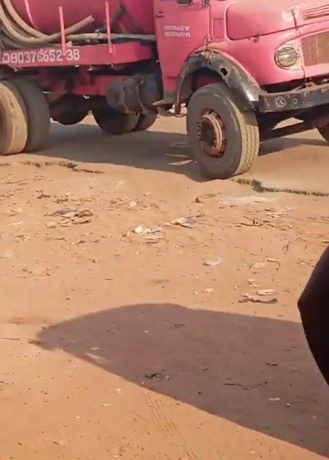 pink septic tank truck labeled "OAK AWAY 08037665238" driving through a dirt road towards a crowd of people dressed in white. A man wearing a navy blue sleeveless shirt and khaki pants stands on the side of the road, looking at the truck. There is litter and debris on the dirt road. Other parked vehicles are visible, and a house with green trim can be seen in the background. Several individuals wearing military uniforms can also be seen in the crowd.