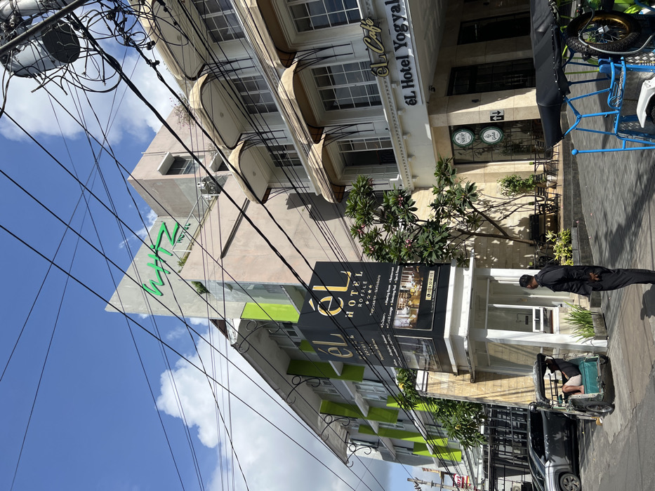An outdoor shot shows the exterior of the El Hotel Royale Yogyakarta in Indonesia. The multi-story building has both modern and classic architectural elements. A large, black sign displays "el Hotel Royale Yogyakarta". Power lines are visible against the sky. A man in dark clothing is standing in front of the hotel. A car and a rickshaw are parked nearby. The sky is blue with white clouds.