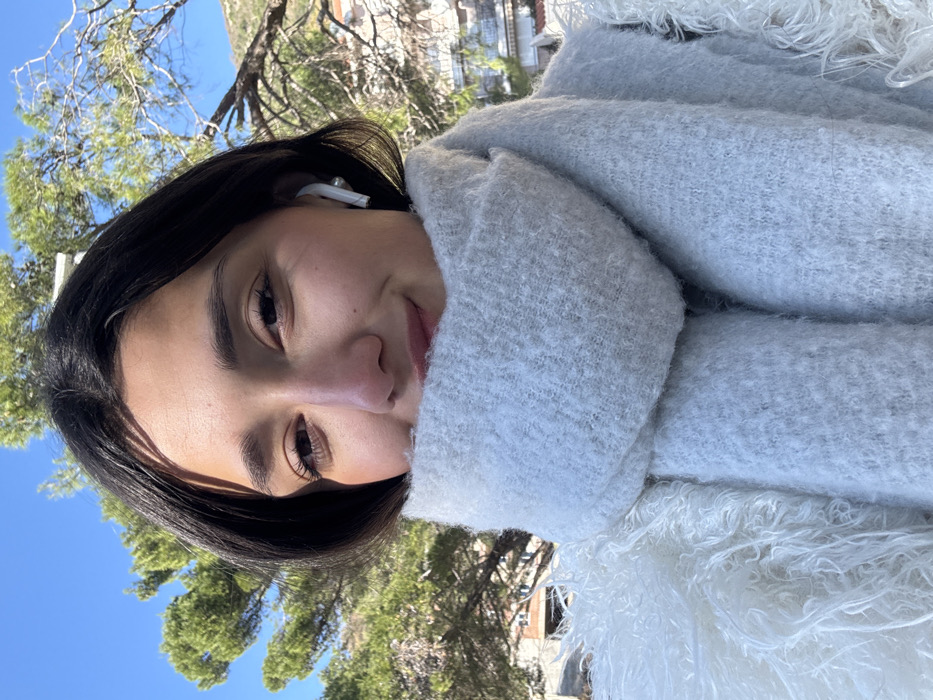 A close-up selfie depicts a young adult female from the chest up, positioned centrally. She has dark hair and is looking directly at the camera with a slight smile. A white wireless earbud is visible in her right ear. She is wearing a thick, light gray, textured scarf that covers her lower face up to her nose, and an outer garment with shaggy, white, possibly faux fur texture is visible on her shoulders. The background reveals an outdoor setting under a clear blue sky. Green coniferous trees dominate the mid-ground. Faintly visible behind the trees, in the distance, are light-colored buildings with dark roofs, indicative of urban or residential structures. The scene is illuminated by bright sunlight. The location is Donji Katun, Montenegro.
