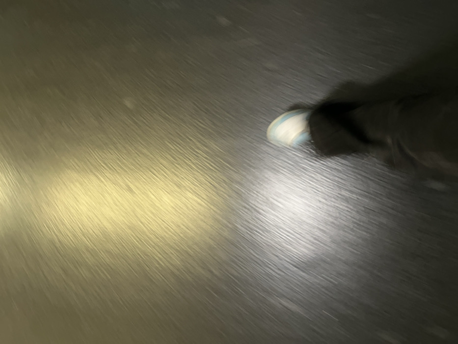 The image captures an interior scene in Paris, France, from a downward-angled perspective, documenting a human foot in motion over a reflective floor. Extensive linear motion blur is present across the entire frame, indicating forward movement. The ground surface is dark gray to black, exhibiting streaks characteristic of brushed metal or a highly polished, utilitarian material. Overhead artificial lighting is evident, with a prominent yellowish-golden reflection diagonally across the upper-left quadrant of the floor and a secondary, diffuse white reflection towards the lower-middle-right. In the bottom-right quadrant, a human right foot, clothed in dark trousers, is visible mid-stride. The foot wears a closed-toe shoe that is primarily white with a distinct light blue accent stripe. The environment is consistent with a public transit area, such as a metro station, train station, or airport terminal, marked by its robust flooring and artificial illumination.